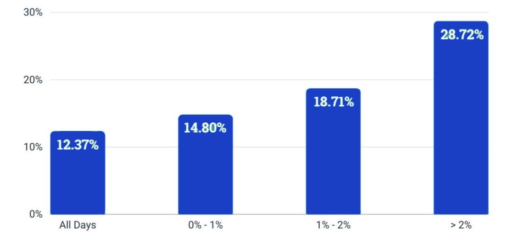 While returns for all days averaged north of 12%, on days when the market was down between 0% and 1%, the subsequent 12-month returns exceeded 14% on average. When we look at returns one year later for days the market was down between 1% and 2%, returns exceeded 18% on average. And when the market experienced a dip of more than 2%, the average returns one year later were beyond 28% on average.