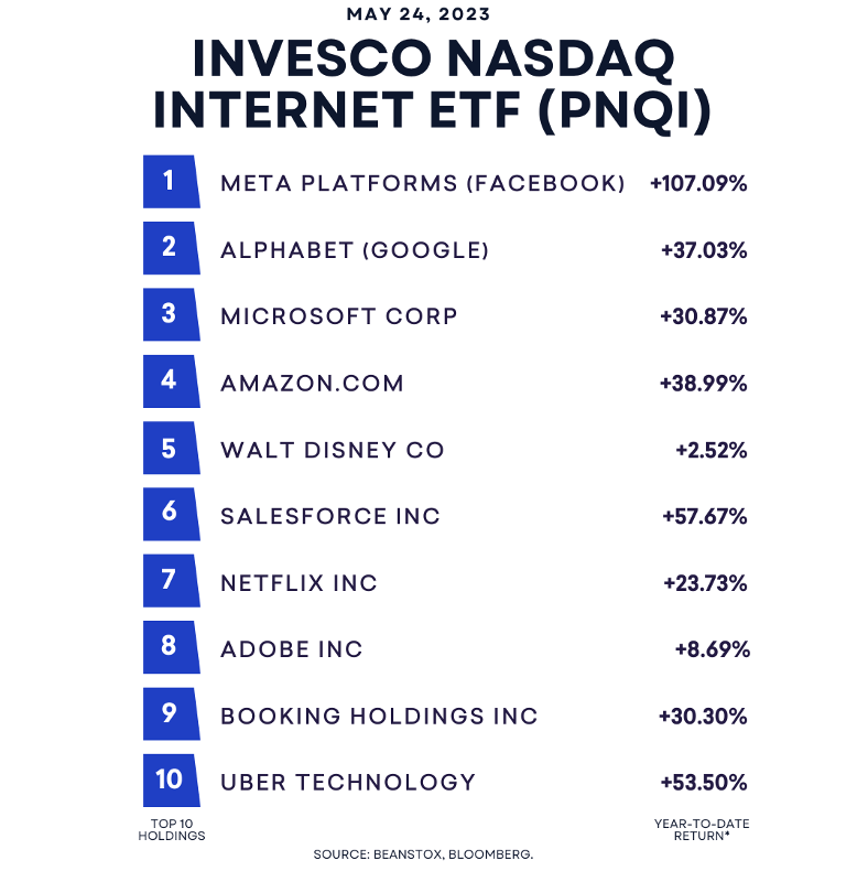 So far, in 2023, technology-related stocks have been leading the market higher. Among the wide array of tech stocks, let’s look at the top ten holdings within the Invesco NASDAQ Internet ETF (PNQI). It’s worth noting that your Personalized Beanstox Portfolio could potentially include these stocks through this ETF or others, based on your specific investment goals and risk tolerance.*