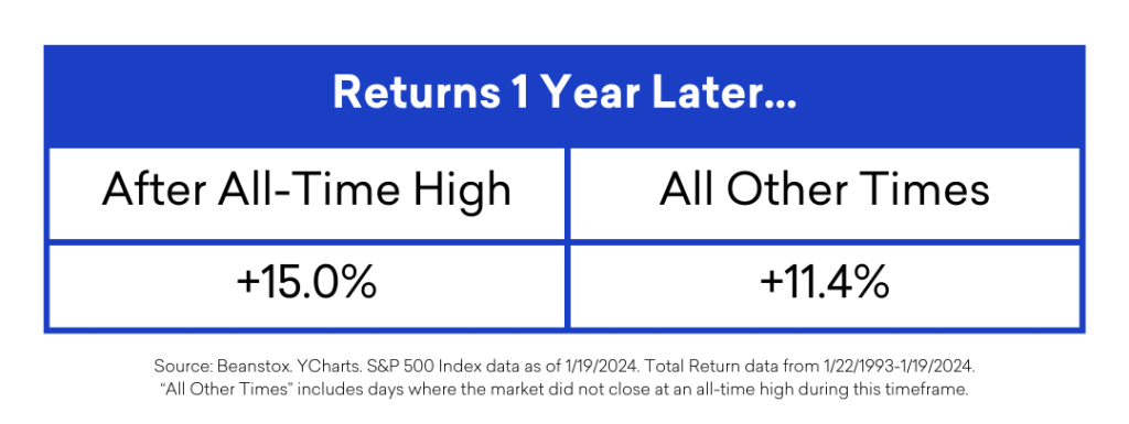 You might think a record high means the market has peaked, however history suggests that all-time highs are often followed by (you guessed it) new all-time highs! Market highs generally occur when markets are strong and strong markets can keep going up.