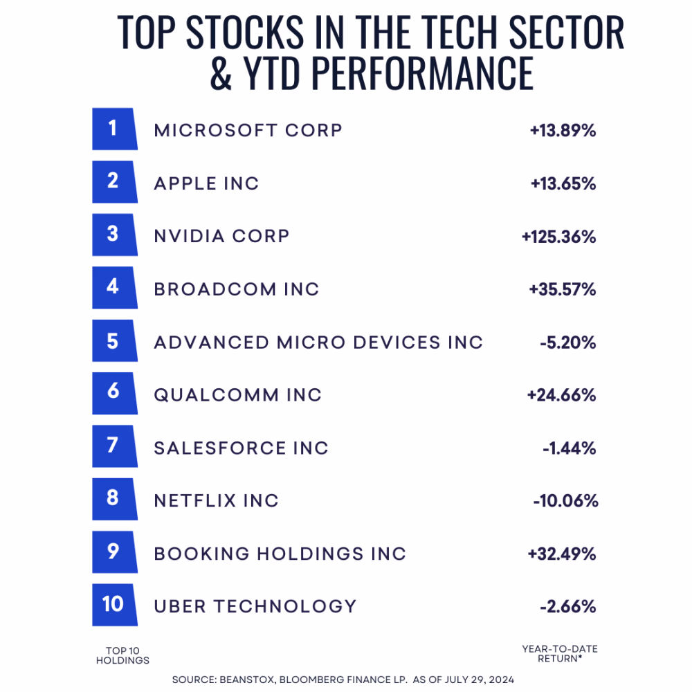 Tech stocks have returned over 16% year-to-date and have generated an annualized 10-year return over 20% as of 7/29/2024.