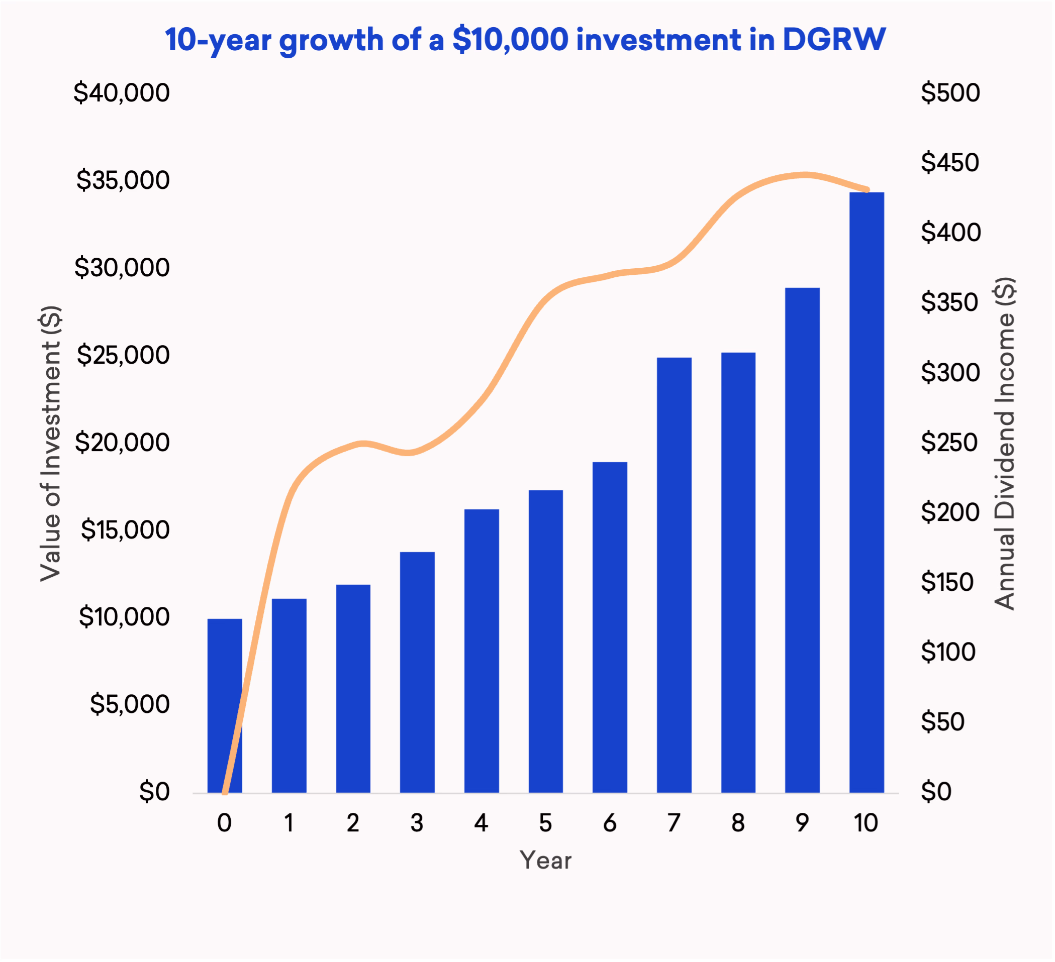 Dividend Growth ETFs, as represented by WisdomTree U.S. Quality Dividend Growth Fund (DGRW), have historically provided strong returns, with an annualized 10-year return of over 13% as of 7/31/2024¹. Over the past 3, 5, and 10 years, DGRW has delivered average annual returns of 11.3%, 14.3%, and 13.1%, respectively. Hypothetically, if you invested $10,000 in DGRW ten years ago, your investment would have grown to approximately $34,000, and your annual dividend income would have grown to over $430 as of 7/31/2024. That is about 7% annual income growth which can help keep ahead of inflation.
