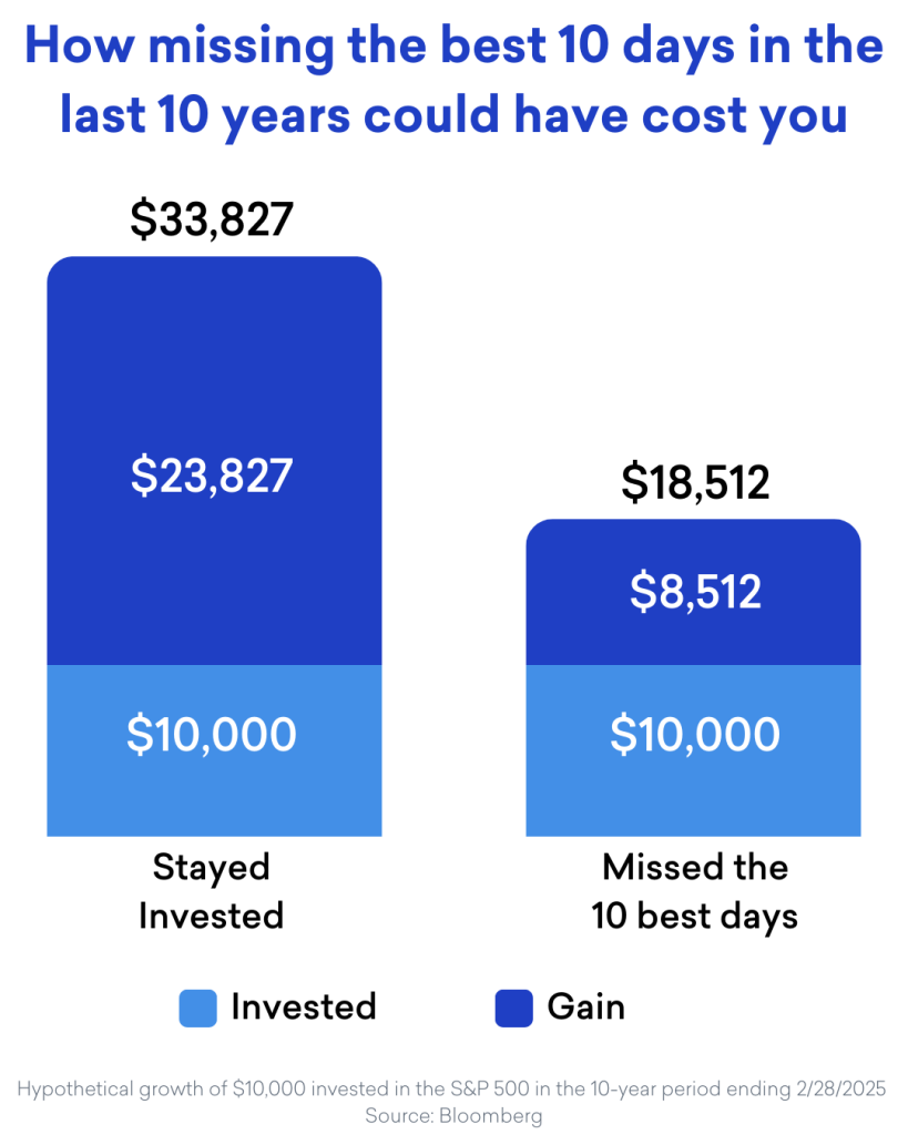 Timing the market is nearly impossible, and missing just a few of the best days by selling could be costly. Often, the best market days come right after the worst ones. So, avoid that FOMO feeling by staying invested.