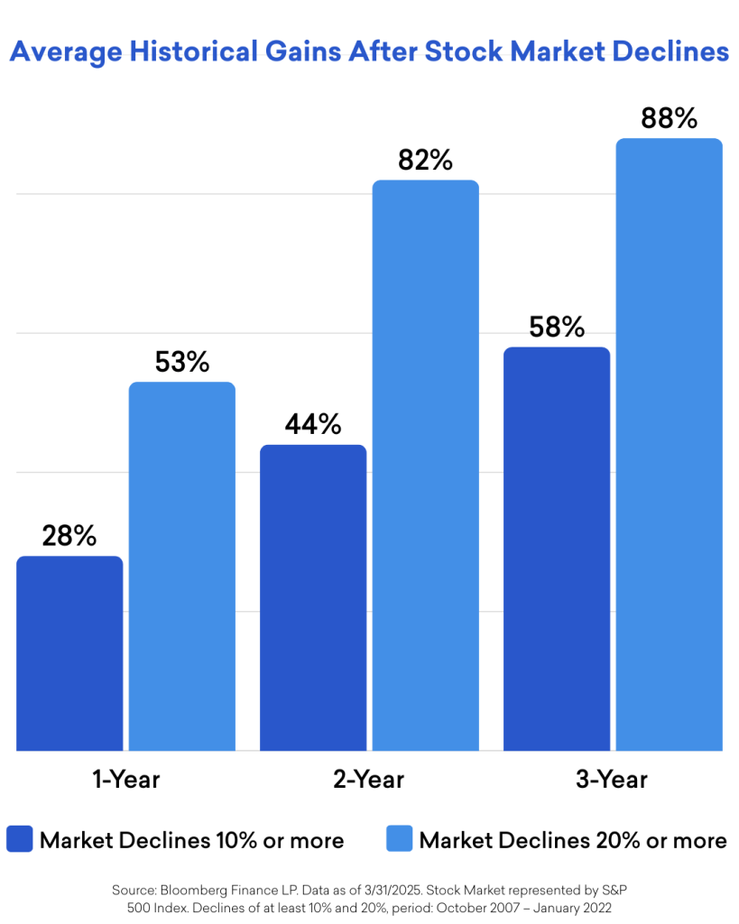 It’s normal for stocks to have ups and downs. Instead of panicking when the market drops, think of it as stocks going on sale—it’s your chance to buy more at lower prices. Historically, the market has always bounced back after downturns. Some big returns have followed some of the biggest declines. Remember, this could be an opportunity!