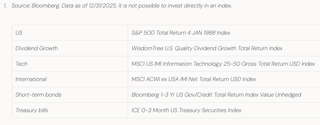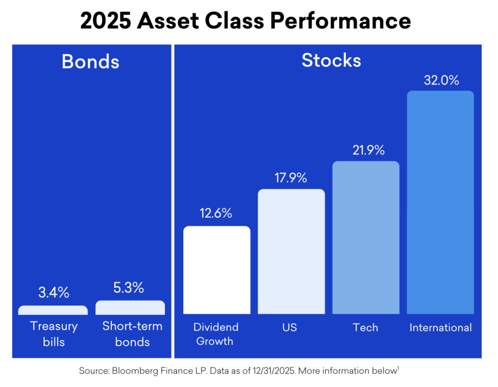 In 2025, different assets took turns leading, while some recent winners dropped. U.S. stocks were strong. Gold had an exceptional year. Bitcoin was volatile, temporarily dropping about 30%, ending the year down about 6%.